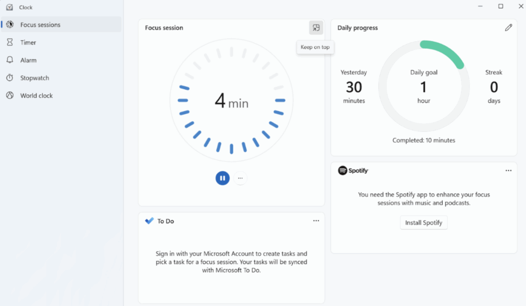Task / Music IntegrationWindows Clock app links to Microsoft To Do + Spotify. You choose a task to focus on and optionally play focus-friendly music.Less context switching – task, timer, music all ready.
