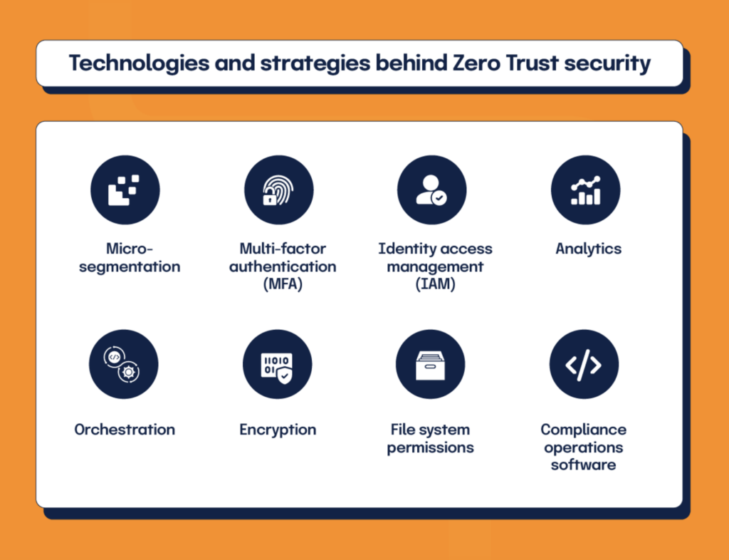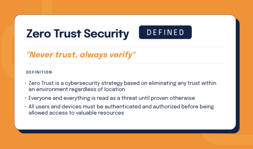 - Trust Rule: Never trust. Always verify. (That means confirming identities, device status, and intent before allowing access.)